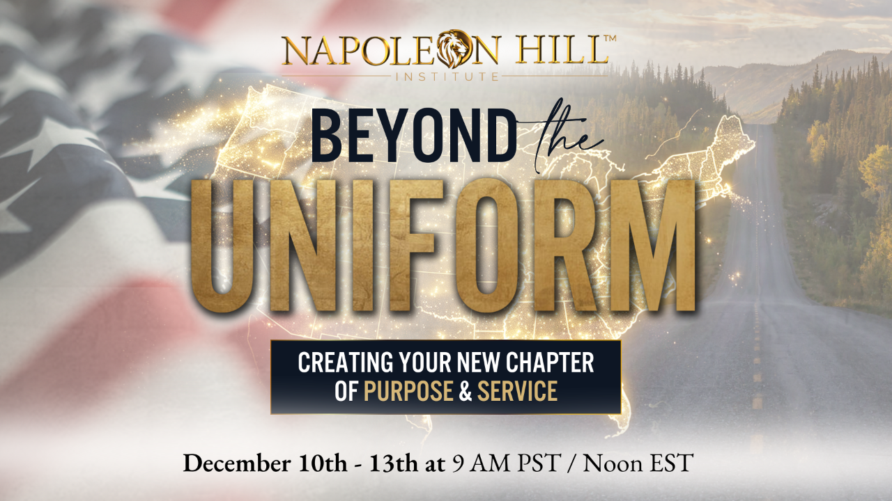 Are you a military member transitioning to civilian life or a veteran looking to create a fulfilling next chapter? The Napoleon Hill Institute proudly presents a life-changing, 4-day virtual event designed exclusively for veterans and their families.